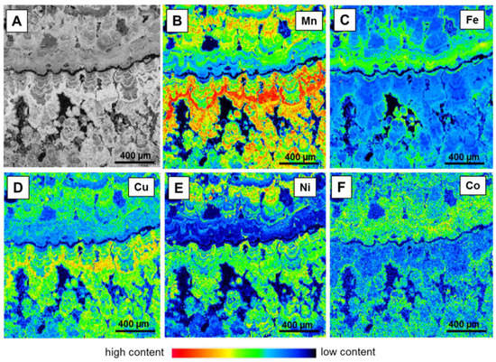 (A) Backscattered electron (BSE) image and (B–F) element distribution maps of Mn, Fe, Ni, Cu, and Co of growth structures of a Mn nodule from the CCZ. Genetically different growth structures as well as the different Mn and Fe (oxy)hydroxides are intergrown with each other on a very fine scale (nm–µm).