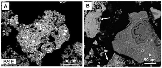 The mineralogical composition of the particles was quantitatively determined using SEM/mineral liberation analysis techniques (SEM/MLA-XBSE (X-ray backscatter electron) [37,38]). In each section, the chemical composition was identified using energy-dispersive X-ray spectrometry (EDS) combined with backscattered electron (BSE) imaging. In a first step, BSE images are collected, and based on the grey values of the particles in the images, an automated function performs de-agglomeration and definition of individual particles. Afterwards, all distinct grains and their boundaries are accurately defined. X-ray analyses are performed using a point procedure. Every particle with a different grey value will be measured with EDS. The measured mineral spectra will be compared with spectra of pre-defined mineral standards to determine the mineral identity for each grain.