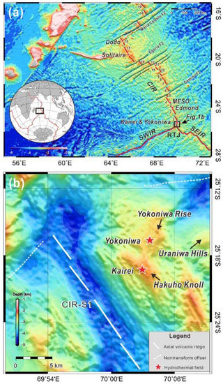 (a) Geological map of the Central Indian Ridge (CIR) and (b) location of the Kairei vent field. Other known hydrothermal fields are indicated by red stars. Note, segment numbering is from Okino et al. (2015) [28]. SWIR = Southwest Indian Ridge; SEIR = Southeast Indian Ridge. Bathymetry data source: Global Multi-Resolution Topography (GMRT) synthesis [29].