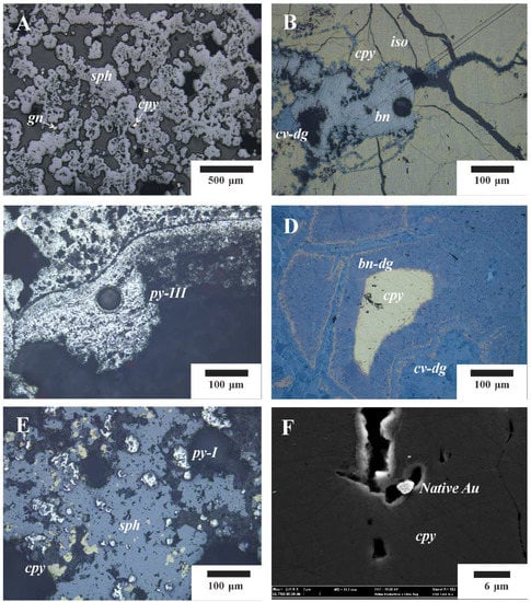 Optical and SEM photomicrographs of typical mineral assemblages. (A) colloform sphalerite and galena grains in the Zn-rich chimney sulfides (sample 17A-TVG9); (B) massive chalcopyrite intensely intergrown with isocubanite and surrounded by bornite and covellite–digenite intergrowths (sample 17A-TVG7-1D); (C) colloform pyrite in outlier of the Zn-rich chimney sulfides (sample 17A-TVG9); (D) bornite–digenite and covellite–digenite intergrowth surrounding chalcopyrite (sample 19III-TVG6); (E) massive sphalerite and co-genetic chalcopyrite and euhedral pyrite (sample 17A-TVG9); (F) native gold particles associated with chalcopyrite (sample 17A-TVG7-1D). Abbreviations: bn–dg = bornite–digenite intergrowths, cpy = chalcopyrite, cv–dg = covellite–digenite intergrowths, py = pyrite, sph = sphalerite.