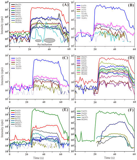 Representative time-resolved LA-ICP-MS depth profiles of selected elements in sulfide minerals from the Kairei vent field. (A) subhedral pyrite in Zn-rich chimney sulfides with inclusions of native gold; (B) chalcopyrite in the Cu-rich massive sulfide samples shows a homogeneous distribution of Ni, As, and Tl; (C) chalcopyrite showing a homogeneous distribution of Co, As, Mo, and Pb; (D) sphalerite with co-varying amounts of Fe and Co, Ag, Ga, Sn, and Mn; (E) early bornite with homogeneous Bi, Co, Mo, Ag, and Te distribution indicated by the flat signal intensities; (F) early bornite with elevated Zn, Bi, and Se.