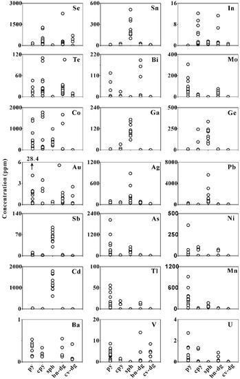 Sphalerite (n = 10) from Zn-rich chimneys was characterized by higher concentrations of Pb (363–5616 ppm), Cd (609–1792 ppm), Co (196–993 ppm), As (60.7–502 ppm), Ag (43.7–882 ppm), Sn (101–510 ppm), Ge (72.2–336 ppm), Ga (57.1–173 ppm), and Sb (29.7–94.2 ppm) relative to the other minerals. Sphalerite had depleted in Se, Te, Bi, Mo, Au, Ni, Tl, Mn, Ba, V, and U when compared to the other sulfide minerals (Figure 4, Table 2).