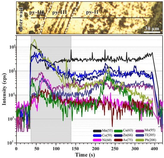 A line scan analysis in chimney sample 17A-TVG9 conducted across a boundary between colloform py-III and subhedral pyrite II (Figure 5) exemplified the differences. The ablation of colloform py-III was marked by high trace element concentrations (Mn, Pb, Cu, Zn, Co, and Mo) that generally decreased towards the more homogeneous subhedral py-II.