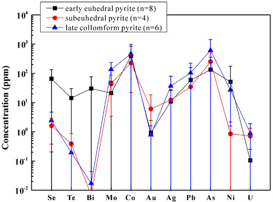 A total of nineteen spot analyses was completed on pyrites selected from different samples of the Kairei vent field, including eight euhedral pyrites (py-I), five subhedral pyrites (py-II), and six colloform pyrites (py-III). Pyrite is generally enriched in Mo, As, Tl, Mn, and U compared to the other investigated sulfide minerals (Figure 4, Table 2). Pyrite with different textures showed distinct variations in the trace element contents (Figure 5 and Figure 6, Table 2). Compared to the other textural types, euhedral py-I tended to have higher contents of Se (up to 168 ppm; average: 65.3 ppm), Ni (up to 363 ppm; average: 51.4 ppm), Bi (up to 123 ppm; average: 30.4 ppm), and Te (up to 46.0 ppm; average: 14.3 ppm), when compared to py-II and py-III. Colloform py-III had distinctly higher concentrations of Mo (46–307 ppm; average:136 ppm), Pb (14–295 ppm; average: 105 ppm), and U (up to 2.73 ppm; average: 0.90 ppm) but was poor in Se, Te, Bi, and Au. Subhedral py-II was poor in most trace elements, but one single spot showed abnormally high Au concentrations (28.4 ppm; Table S2). However, enrichments of As (up to 2041 ppm) and Co (up to 1453 ppm) were common in all generations of pyrites. Py-I contained 395 ppm Co and 135 ppm As, on average; py-II had average As and Co concentrations of 254 ppm and 230 ppm, respectively; while py-III was characterized by concentrations of 614 ppm As and 466 ppm Co, on average.