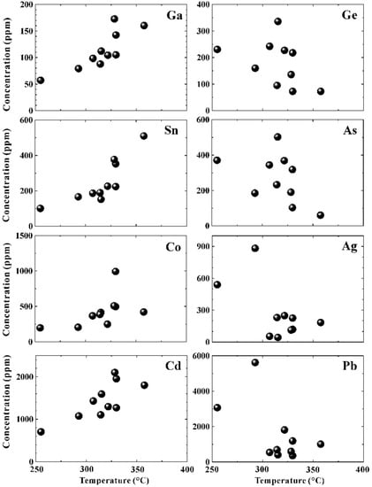 Correlation between the concentrations of trace elements in sphalerite and precipitation temperatures calculated from Keith et al. (2014) [53].