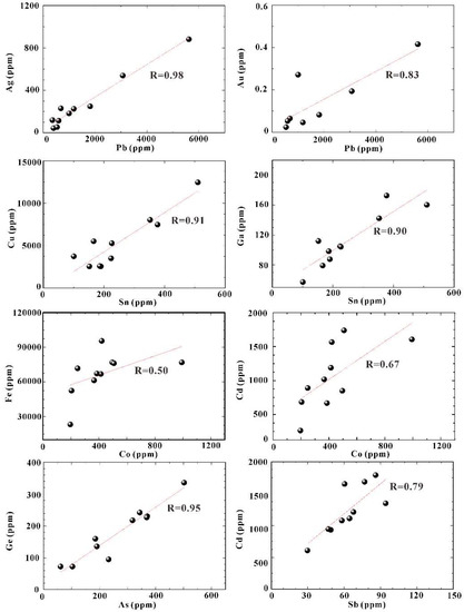 Trace element correlations of sphalerite for Pb–Ag, Pb–Au, Sn–Cu, Sn–Ga, Co–Fe, Co–Cd, As–Ge, and Sb–Cd from Zn-rich chimney samples.