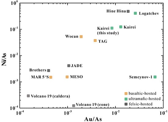 Variations of Ni/As vs. Au/As in pyrite from ultramafic- and mafic-hosted hydrothermal systems at mid-ocean ridges and felsic-hosted sites occurred in the back-arc basin/arc volcanoes. See the data source in Table 3.
