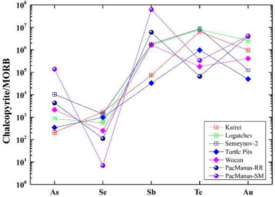Selected MORB-normalized trace element patterns for chalcopyrite from different seafloor hydrothermal systems. MORB data source from Arevalo and McDonough (2010) [48].