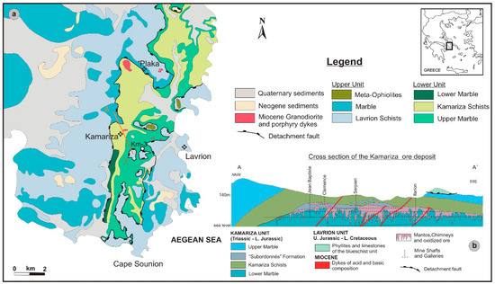 - Scheffer, C.; Tarantola, A.; Vanderhaeghe, O.; Voudouris, P.; Rigaudier, T.; Photiades, A.; Morin, D.; Alloucherie, A. The Lavrion Pb-Zn-Fe-Cu-Ag detachment-related district (Attica, Greece): Structural control on hydrothermal flow and element transfer-deposition. Tectonophysics 2017, 717, 607–627. [Google Scholar] [CrossRef]
