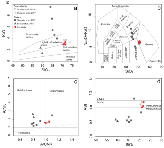 - Stouraiti, C.; Mitropoulos, P.; Tarney, J.; Barreiro, B.; McGrath, A.M.; Baltatzis, E. Geochemistry and petrogenesis of late Miocene granitoids, Cyclades, southern Aegean: Nature of source components. Lithos 2010, 114, 337–352. [Google Scholar] [CrossRef]