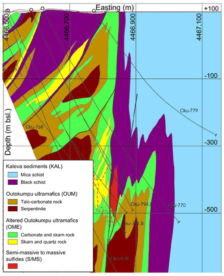 The Kylylahti mine is located in the Outokumpu mining district, where the first copper mine was opened in 1913. The predominant geology of this area is described in detail by [40]. In the Kylylahti area, the geology can be characterized in terms of four units (see Figure 1): (1) The Kylylahti deposit, a Semi-massive to massive sulfide (S/MS) mineralization, is associated with (2) ultramafic rocks Outokumpu ultramafics (OUM) that mainly consist of serpentinite and talc-carbonate rocks. These are fringed by (3) alteration zones of a few to several tens of meters thickness composed of carbonate-skarn-quartz rocks, the Altered Outokumpu ultramafics (OME). In combination, the nearly N-S trending and near-vertical OUM and OME units are called the Outokumpu assemblage rocks, which are embedded in (4) the regional Kaleva Sedimentary Belt (KAL). The Kaleva sediments consist of mica schist and black schist. They form a near-vertical contrast with the Outokumpu assemblage rocks (OUM + OME). Moreover, black schist interlayers also occur in the severely folded Outokumpu assemblage package, where various rock contacts are repeated several times.