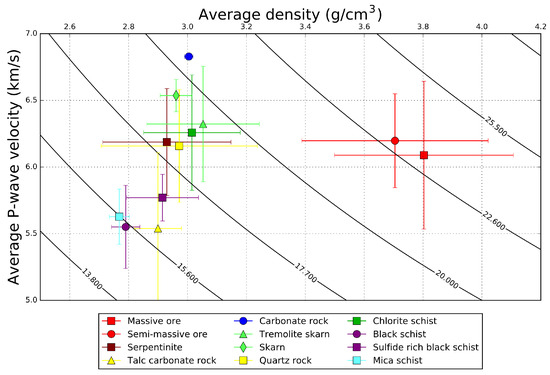 Results of petrophysical laboratory analysis of rock samples from the Kylylahti mine area (modified after [49]). Error bars indicate respective standard deviations. Contour lines denote the P-wave (acoustic) impedance. The line spacing corresponds to a reflection coefficient of 0.06, which is necessary to produce a detectable reflection [24].