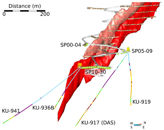 The acquisition configuration of the VSP experiment is shown in Figure 3 and summarized in Table 1. In total, four boreholes from prior exploration drilling were used, which are located adjacent to and inclined towards the target mineralization (Figure 3). The VSP recording systems were deployed in these boreholes. A VIBSIST-200 system was used as a seismic source, which represents a multi-impact, time-distributed source [50,51]. The advantages of this system consist of its mobility, the high frequency of the source signal (180 Hz) and the high signal-to-noise ratio that is achieved by stacking of multiple impacts. The source was fired from 31 distinct shot locations inside the mine tunnels. The locations can be grouped into three different depth levels: the first five shots (SP00–04) were located in a tunnel above the mineralization at ≈550 m depth; shots SP05–09 were positioned at ≈580 m along the main decline; and shots SP10–30 were located in a tunnel at 635 m depth below mean sea level. Data recorded from the first group of shots were found to have almost no reflected energy, which is most likely due to the acquisition geometry. Thus, these shots were excluded from the detailed analysis and interpretation later on.