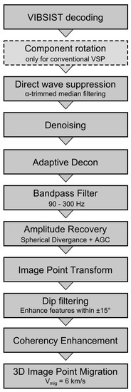 After successful acquisition, geophone VSP and DAS VSP data were processed using a VSP-specific processing flow (Figure 4). Most elements in the flow were commonly applied to both datasets, except for the component rotation, which was only done for the geophone VSP data. For this, A 3C rotation was used, based on polarity analysis of the first arrival maximum energy direction of incidence. Commonly-applied processing steps include suppression of direct P- and S-wave arrivals, denoising, the time-varying deconvolution method based on adaptive linear filtering techniques, bandpass filtering and amplitude recovery. The specific parameterizations of these steps varied slightly between the DAS and VSP records due to the different nature of the data.