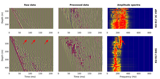 Figure 5 shows a comparison between the geophone VSP and DAS VSP data for shot point SP06 (zero-offset shot; see Figure 3). It compares the respective shot records before and after processing, as well as the raw amplitude spectra. It has to be noted that the obtained records do not show the same physical quantity, i.e., they show particle velocity for 3C geophones versus strain rate for DAS. Hence, the comparison is mainly restricted to the kinematics of the data. The amplitudes can be compared on a qualitative, but not on a quantitative level.