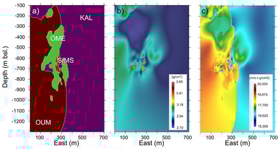 Vertical sections through geological and petrophysical models used for seismic forward modeling study. (a) Model of the larger geological domains that were used to define the P-wave velocities. (b) Kriging interpolated density model obtained from specific gravity measurements of borehole core logs. (c) Acoustic impedance model calculated from the P-wave velocity model (a) and density model (b).