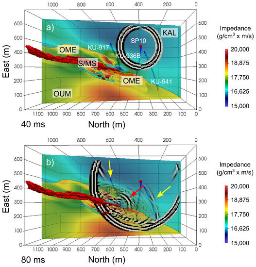 A selection of synthetic shot records obtained form the simulation is shown in Figure 8. In combination, the synthetic data and snapshots reveal that the first strong signal that is recorded by the VSP receivers (yellow arrow in Figure 7 and Figure 8) originates not directly from the target S/MS deposit, but from the contrast between the Kaleva sediments (KAL) and the Outokumpu alteration fringes (OME). The sulfide reflection (red arrow in Figure 7 and Figure 8) appears later in the synthetic shot record and is more difficult to identify than the previous one. These observations help in guiding the geological interpretation of the migrated shot records.