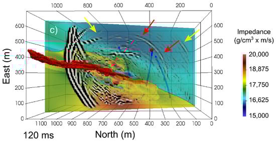 Wavefield snapshots over acoustic impedance model at time steps of 40 ms (a), 80 ms (b) and 120 ms (c). The semi-massive to massive sulfide mineralization is depicted as a 3D red surface. Virtual receivers for boreholes KU-917, KU-936B and KU-941 are shown as blue solid lines. The source position for shot SP10 is shown as a red sphere. Yellow arrows in (b,c) highlight the reflection from the KAL-OME contrast, whereas red arrows denote a reflection arising from the S/MS deposit. The synthetic shot records are shown in Figure 8.