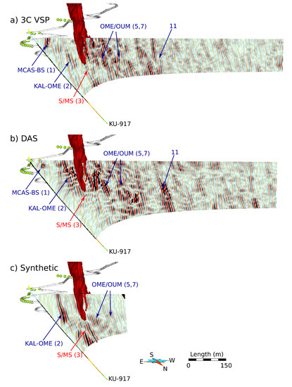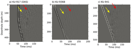 Synthetic VSP shots obtained from seismic forward modeling for virtual receivers along borehole KU-917, DAS configuration (a), KU-936B (b) and KU-941 (c). Arrows indicate reflections from the KAL-OME contrast (yellow) and the S/MS deposit (red) (compare to Figure 7).