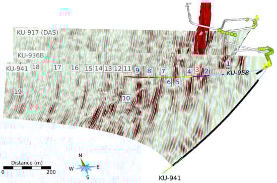 In total, 83 individual migrated shot records were obtained from the acquired VSP data. These images were analyzed jointly to trace predominant reflections through the illuminated area parallel to the target sulfide mineralization (Figure 10). In this way, 19 distinct reflections were identified that were evidenced by the majority of the computed reflectivity images. In particular, 14 out of 19 contrasts were evidenced by at least 65%, and six out of 19 (Reflections 3–8) were evidenced by at least 75% of the migrated images. Most of the less supported features occur further to the west.