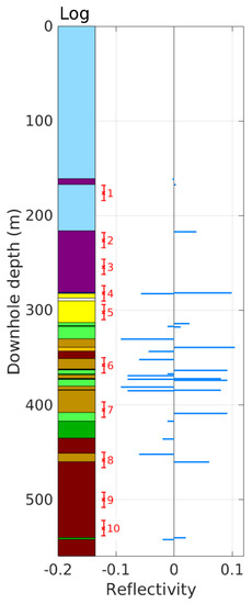 Figure 11 shows a comparison between the KU-958 log, a synthetic reflectivity series derived from petrophysical measurements of the logged rock types, and the identified reflections from the closest migrated image. It demonstrates how most reflections identified from VSP migration results correspond to lithological contrasts evidenced in the borehole log. Very closely-spaced interfaces (e.g., between Reflections 4 and 7) could not be individually resolved by the VSP method due the inherent limitations of spatial resolution. The dominant P-wavelength (16.1 m) is depicted by error intervals in Figure 11. Moreover, Reflectors 2, 3 and 9 are not evidenced in the log.