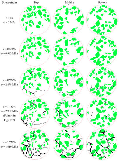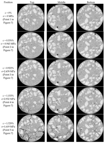 | Loading Stage | Axial Strain (%) | Axial Stress (%) | Top Slice ∆s(mm2) | Middle Slice ∆s(mm2) | Bottom Slice ∆s(mm2) |