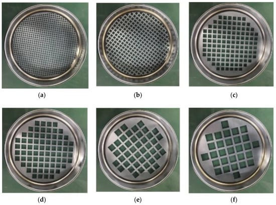 Square aperture sieves. (a) 5 mm. (b) 10 mm. (c) 15 mm. (d) 20 mm. (e) 25 mm. (f) 30 mm.