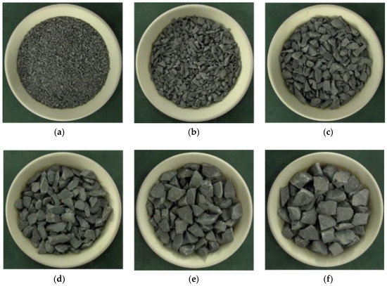 Samples of crushed sandstone with different particle sizes: (a) 0–5 mm, (b) 5–10 mm, (c) 10–15 mm, (d) 15–20 mm, (e) 20–25 mm, (f) 25–30 mm.