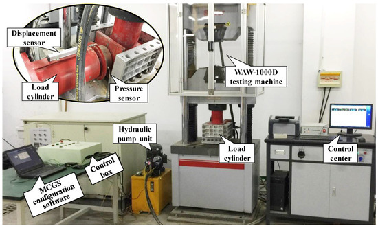 By employing a self-designed bidirectional loading test system for granular materials, the compaction characteristics of waste rocks used for backfilling were tested. This system comprises an axial loading system and a lateral loading system, which can realise lateral and axial loading of the crushed waste rock samples, as shown in Figure 3. The axial loading system consists mainly of the WAW-1000D electro-hydraulic servo testing machine (Sinter, Changchun, China). The lateral loading system includes a hydraulic pump unit, an oil cylinder for loading, a control box, a pressure sensor, a displacement sensor, a laptop, and a data acquisition device (Figure 4).