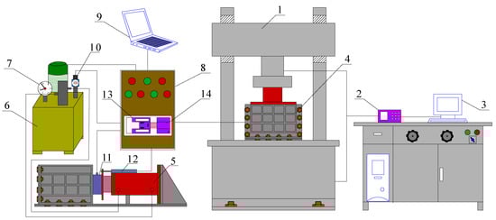 Schematic diagram of the structure of the test system. (1): Testing machine; (2): Controller; (3): Computer; (4): Loading box; (5): Oil cylinder for loading; (6): Hydraulic pump unit; (7): Pressure gauge; (8): Control box; (9): Laptop; (10): Pressure transmitter; (11): Pressure sensor; (12): Displacement sensor; (13): PLC controller; (14): Analog input and output modules.
