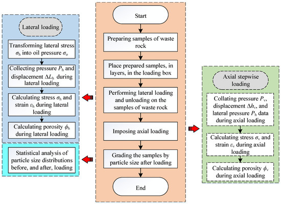 To study the influence of lateral stress on compaction characteristics of these crushed waste rock samples, compaction tests were conducted on waste rocks used for backfilling under four lateral stresses (0, 1, 2 and 3 MPa) in combination with the bidirectional loading test system for granular materials. Moreover, the influence of lateral stress on the compaction characteristics of waste rocks used for backfilling was analysed. The specific test steps are shown in Figure 5.