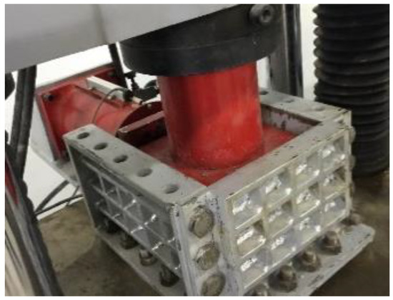 After lateral loading, the upper cover plate was removed. At this time, due to the small elastic rebound of the waste rocks, the height of the samples was slightly higher than 200 mm (the height of the loaded samples). The upper press plate was placed on the samples and pre-compaction conducted by using the testing machine to restore the height of the samples to 200 mm. Then, the pressure applied during axial loading was set and an axial load applied to the samples (Figure 6). Lateral pressure, axial pressure, and axial displacement data under axial loading were monitored and recorded in real time.