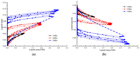 (2). For samples under higher lateral stress, the reduction in lateral porosity was larger. For instance, the lateral porosity of samples under a lateral stress of 3 MPa decreased by 0.067 from 0.475 to 0.408, while lateral porosities of the samples under lateral stresses of 1 and 2 MPa were reduced by 0.021 and 0.033, separately. This indicates that the samples under a lateral stress of 1 MPa showed smaller lateral deformation under lateral loading, while the lateral deformation of samples under a lateral stress of 3 MPa was greater.