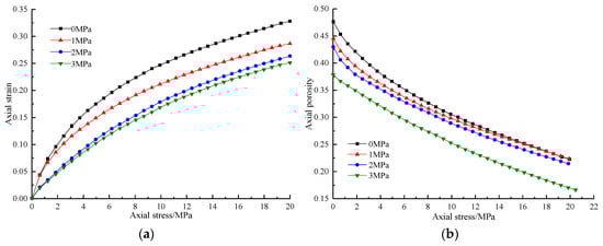 (2). For samples under a lower lateral stress, the reduction in axial porosity was greater. For example, the porosity of samples under a lateral stress of 0 MPa fell from 0.476 to 0.225. For samples under lateral stresses of 1, 2 and 3 MPa, the axial porosities fell by 0.223, 0.216 and 0.211, respectively; these differences can be characterised as significant. This demonstrates that samples at a lateral stress of 0 MPa under axial load showed greater axial deformation, while smaller lateral deformation was found in samples under a lateral stress of 3 MPa.