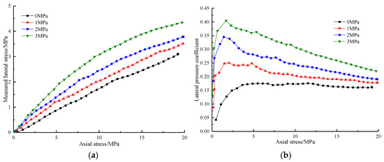 In accordance with test data for samples under axial load and results calculated using Formula (2), the changes in lateral stresses and lateral pressure coefficients of samples under different lateral stresses and axial loads were attained (Figure 10). The lateral pressure coefficient of the samples is the ratio of the horizontal stress to vertical stress.