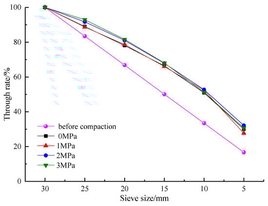 According to the analysis of Figure 11, after compaction, the particle size distribution of the samples of crushed waste rock under the four lateral stresses all shifted upwards in comparison with those before compaction. This indicates that particles were crushed and the proportion of small particles constantly rose. However, because the applied lateral stress was low and did not reach the crushing strength of the particles, the increase in lateral stress could reduce the porosity of the waste rocks used for backfilling while only slightly affecting the crushing of particles before and after compaction.