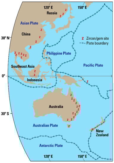 Map showing the 12,000 km long zircon megacryst Indo-Pacific zone (ZIP) along the western Pacific continental margins in Eastern Australasia, Asia, and Russia. The intraplate basalts hosting the megacryst suites are dominantly alkaline in composition and involve deeper mantle generation of magmas that may intersect pre-existing gem-bearing felsic or metamorphic bodies [11]. Consult this reference for zircon locality details.