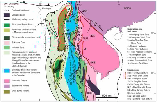 Southeast Asia including Thailand and Cambodia is an assemblage of distinct terranes amalgamated together to form two dominant crustal blocks known as the Indochina and the Shan-Thai (or Sibumasu) terranes (Figure 2). These two terranes are separated and overprinted by Mesozoic and younger arc systems of the Sukhothai Zone (Fold Belt) and the Sa Kaeo Suture Zone (SKS). Although these two terrains have separate geological histories, they both have their origins at the margin of Gondwana prior to collision during the Mesozoic [24]. The Indochina terrain, which extends from Eastern Thailand, Laos, across Cambodia, and into Southern Vietnam, rifted away from the northern edge of Gondwanaland during the Devonian. This resulted in the opening of Paleotethys [25]. Little is known about the Precambrian tectonic history of Thailand and Cambodia even though gneisses and schists of the Proterozoic Kontum massif in Vietnam extend into Northeast Cambodia near the border with Thailand [26]. Similar high-grade metamorphic rocks have been found in Pailin along the border with Thailand [26,27].