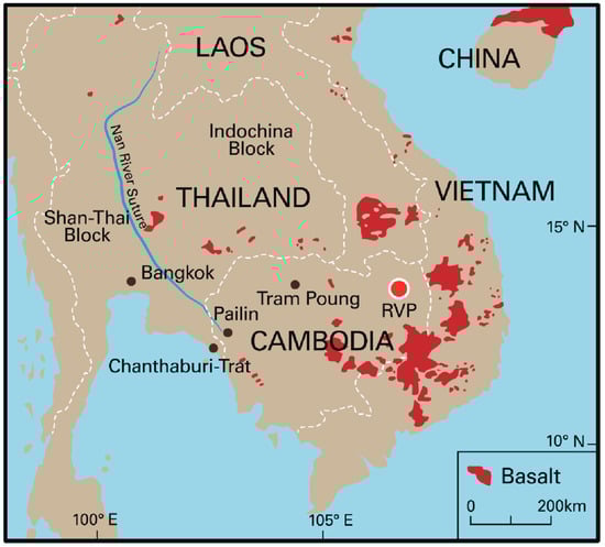 Distribution of Cenozoic alkali basalt provinces (red) in SE Asia (modified after [16]). The location of the Ratanakiri Volcanic Province (RVP) is shown as a red circle.