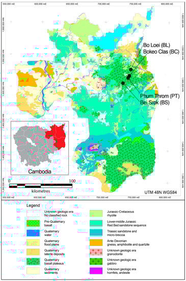 Detailed geological information about Cambodia is difficult to obtain as a result of the destruction of all academic material by the Khmer Rouge. Early work by Lacombe [42,43] concerning the geology, geochemistry, and mineralogy of the RVP basalts is still the most definitive work in existence. Previous 1:500,000 maps by both France (1970s) and Russia (1990) are out of date. Little work has been completed in the country since that time. Detailed mapping, age dating, and geochemical analyses of the rocks in the RVP is currently underway by the lead author.
