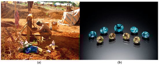 (a) Zircon miner at Phum Throm, Ratanakiri, Cambodia. (b) Natural and heat-treated faceted RVP zircon (each stone is ~0.75 carats). Photo copyright M. Bainbridge, Canadian Museum of Nature collection.