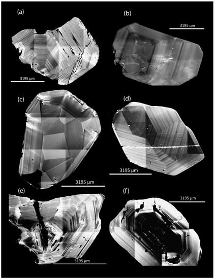 - Benisek, A.; Finger, F. Factors controlling the development of prism faces in granite zircons: A microprobe study. Contrib. Mineral. Petrol. 1993, 114, 441–451. [Google Scholar] [CrossRef]
