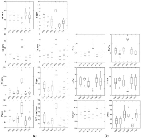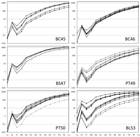 Average EMPA data are shown in Table 1 and representative trace element data (ppm) are shown in Table 2. Rim and core analyses are noted when applicable. Figure 8 depicts box plot diagrams for relevant trace elements (a) and ratios (b) in zircon from each locality. Rare-earth element (REE) data were normalized to C-1 chondrite values [70] and plotted on logarithmic multi-element diagrams (La-Lu, Figure 9). Figure 10 depicts the chondrite-normalized trace element spidergram for the RVP zircon (in shaded orange). Data from Cong et al. [23] as well as for zircon from a variety of rock types [5].