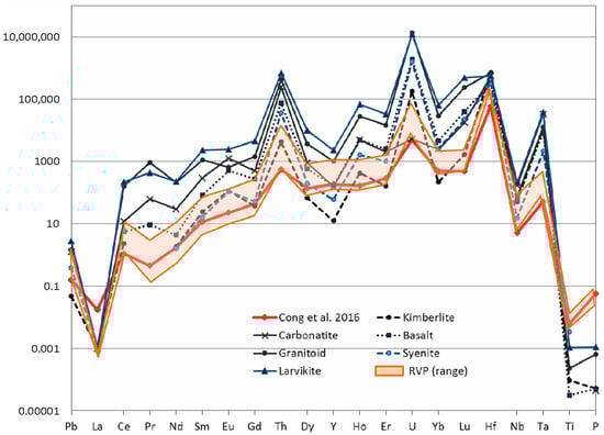 Chondrite-normalized trace element spidergram for zircon from the RVP (orange shaded region) including average data from Cong et al. (red [23]) and zircon from other rock types [5].