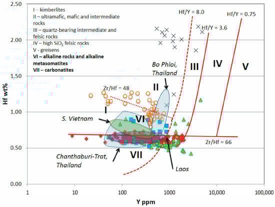 Oxygen isotope ratios provide valuable information about the melt from which the zircon crystallized, which often allows for the discrimination between mantle and crustal sources. Values of δ18O in RVP zircon are homogeneous with δ18O: 4.93 ± 0.05‰ VSMOW (n = 5, Table 5). These values are consistent with those obtained by SIMS for zircon megacrysts from an unknown RVP locality: δ18O = 4.5–5.5 ‰ VSMOW, weighted mean = 5.0 ± 0.18‰ VSMOW, n = 210 [23]. The slow rate of diffusion of 18O in non-metamict zircon, coupled with the large crystal size and primary magmatic compositional zoning indicate the δ18Ozrn to represent initial magmatic values [83,84]. These values are low, but, within the δ18Ozrn range for igneous zircon in high temperature equilibrium with a mantle source (δ18Ozrn = 4.7–5.7‰ VSMOW) and olivine from mantle xenoliths (δ18Ool = 5.15 ± 0.13 ‰ [85]). Similarly, RVP δ18Ozrn are lower than those observed for other alkali basalt-hosted zircon xenocrysts in SE Asia including in Western Cambodia at Pailin (5.95 ± 0.02 ‰), Chanthaburi-Trat and Bo Phloi (Thailand, 5.82–6.16 ‰, Table 5) and Penglai, Hainan Island (South China, δ18Ozrn = 5.31 ± 0.18 ‰ [80]). The lower δ18O values observed in RVP zircon are akin to values observed in zircon from monominerallic anorthoclase xenoliths, which are called anorthoclasites, in alkali basalt at Elie Ness, Scotland (4.49–5.03‰, average 4.78 ± 0.16 ‰; [86]) and in zircon from kimberlite [77,87]. The δ18Ozrn values for RVP zircon suggest crystallization from a homogeneous igneous reservoir in the SCLM underlying the RVP with little to no contamination by supracrustal lithologies.