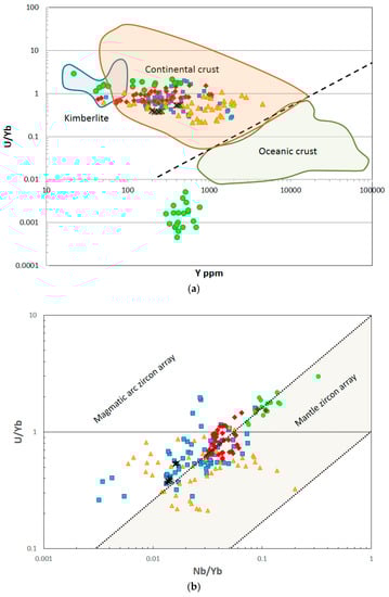 - Grimes, C.B.; Wooden, J.L.; Cheadle, M.J.; John, B.E. “Fingerprinting” tectono-magmatic provenance using trace elements in igneous zircon. Contrib. Mineral. Petrol. 2015, 170, 92–117. [Google Scholar] [CrossRef]