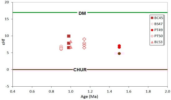 Methodology and an analytical condition for the Lu-Hf isotope analysis are provided by Griffin et al. [48]. Hf-isotope analyses were carried out in situ using a New Wave/Merchantek UP-213 laser-ablation microprobe (New Wave Research, Inc., Petach Tikva, Israel), attached to a Nu Plasma multi-collector ICP-MS (Nu Instruments Ltd., Wrexham, UK) at Macquarie University. The analyses were carried out with a beam diameter 55 µm and a 5 Hz repetition rate. Typical ablation times were 100–120 s and resulted in pits 30–40 µm deep. The ablated sample was transported by He carrier gas from the laser-ablation cell via a mixing chamber to the ICP-MS torch.