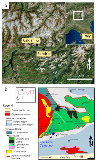 15. Trommsdorff, V.; Montrasio, A.; Hermann, J.; Müntener, O.; Spillman, P.; Gieré, R. The geological map of Valmalenco. Schweiz. Mineral. Petrogr. Mitt. 2005, 85, 1–13. [Google Scholar]