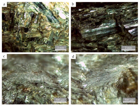 At VLM scale, some darker columnar crystals are visible, as well as diffuse vivid green aggregates, which do not show any preferential orientation (Figure 2a). The columnar habit of dark green to black crystal aggregates is well defined and recognizable at this scale, but streaking parallel to the elongation axis of the crystals points to the presence of a possible asbestiform morphology at smaller scale (Figure 2b). The presence of grey to light green fibers in both random and parallel orientations is visible at higher magnification (Figure 2c,d). The luster is mostly vitreous for columnar and bladed crystals (Figure 2a,b) and silky for asbestiform fibers (Figure 2c,d).