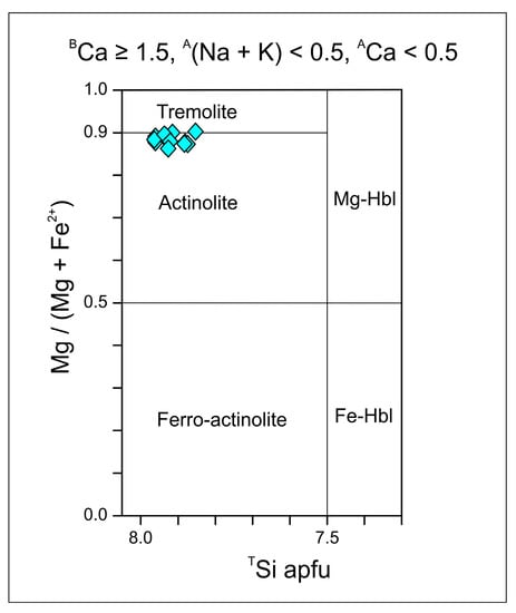 26. Hawthorne, F.C.; Oberti, R.; Harlow, G.E.; Maresch, W.V.; Martin, R.F.; Schumacher, J.C.; Welch, M. IMA Report: Nomenclature of the amphibole supergroup. Am. Mineral. 2012, 9, 2031–2048. [Google Scholar] [CrossRef]